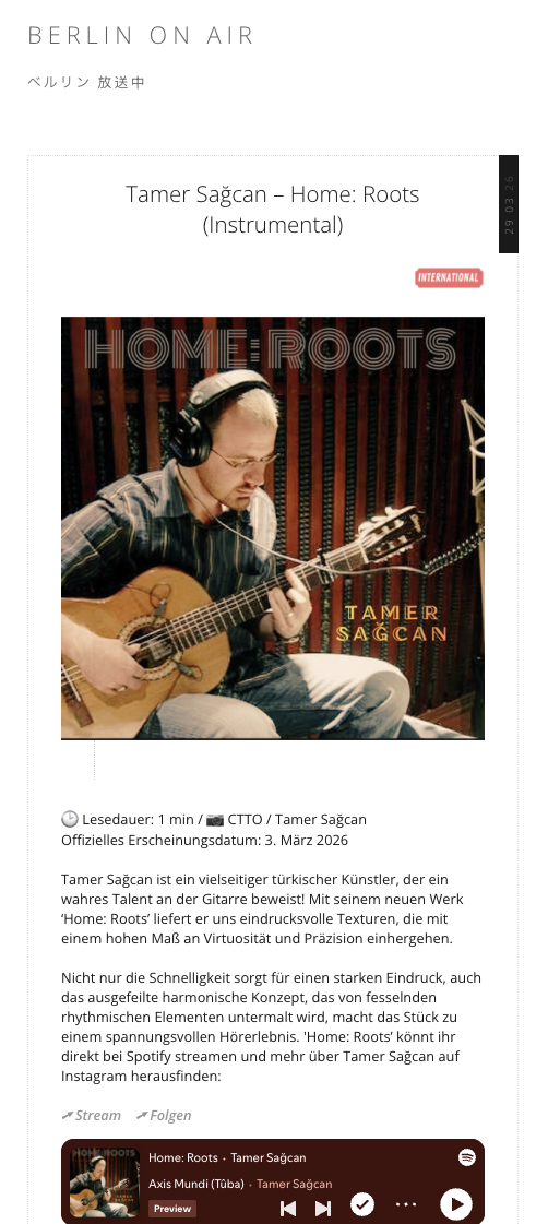 Tamer Sağcan, gitarda gerçek bir yetenek sergileyen çok yönlü bir Türk sanatçı! Yeni eseri “Home: Roots” ile bize yüksek düzeyde virtüözite ve hassasiyetle birlikte gelen etkileyici dokular sunuyor. Sadece hız güçlü bir izlenim bırakmıyor; büyüleyici ritmik unsurlarla desteklenen rafine armonik konsept de eseri gerilim dolu bir dinleme deneyimine dönüştürüyor. “Home: Roots”u doğrudan Spotify’da dinleyebilir ve Tamer Sağcan hakkında daha fazla bilgiye Instagram’dan ulaşabilirsiniz.